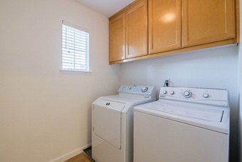 There’s a large kitchen with a eat-in bar island top. There’s lots of cabinet space to make full use of and gorgeous granite-marble countertops. The kitchen opens into the warm and cozy, wide living room! Upstairs, the bedrooms are really roomy and fitted with fresh carpeting and mirrored-doored closet.