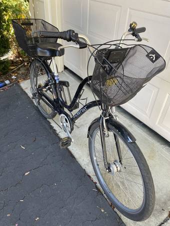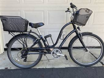 Electra Townie Original 7D Step-Thru, with additional front and back baskets installed, in good condition. Used for riding around campus during undergrad, and commuting from Mountain View to campus for work since. Serviced annually at the Campus Bike Shop. Height is currently adjusted for 5'8" rider, but the seat adjustment tool will also be included, along with the pictured bike lock and key.
