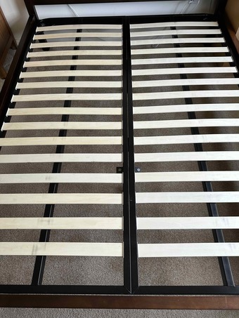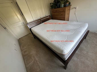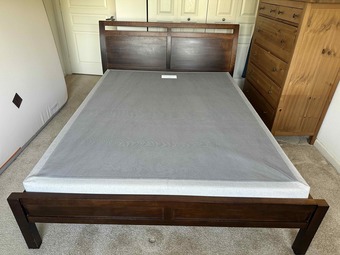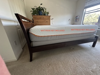 Selling a beautiful solid wood bed frame – sturdy, well-built, and designed to last (not particle board / IKEA quality). We are moving to Europe, can't take that with us. We are a clean, non-smoking, no-pet, vegetarian household.