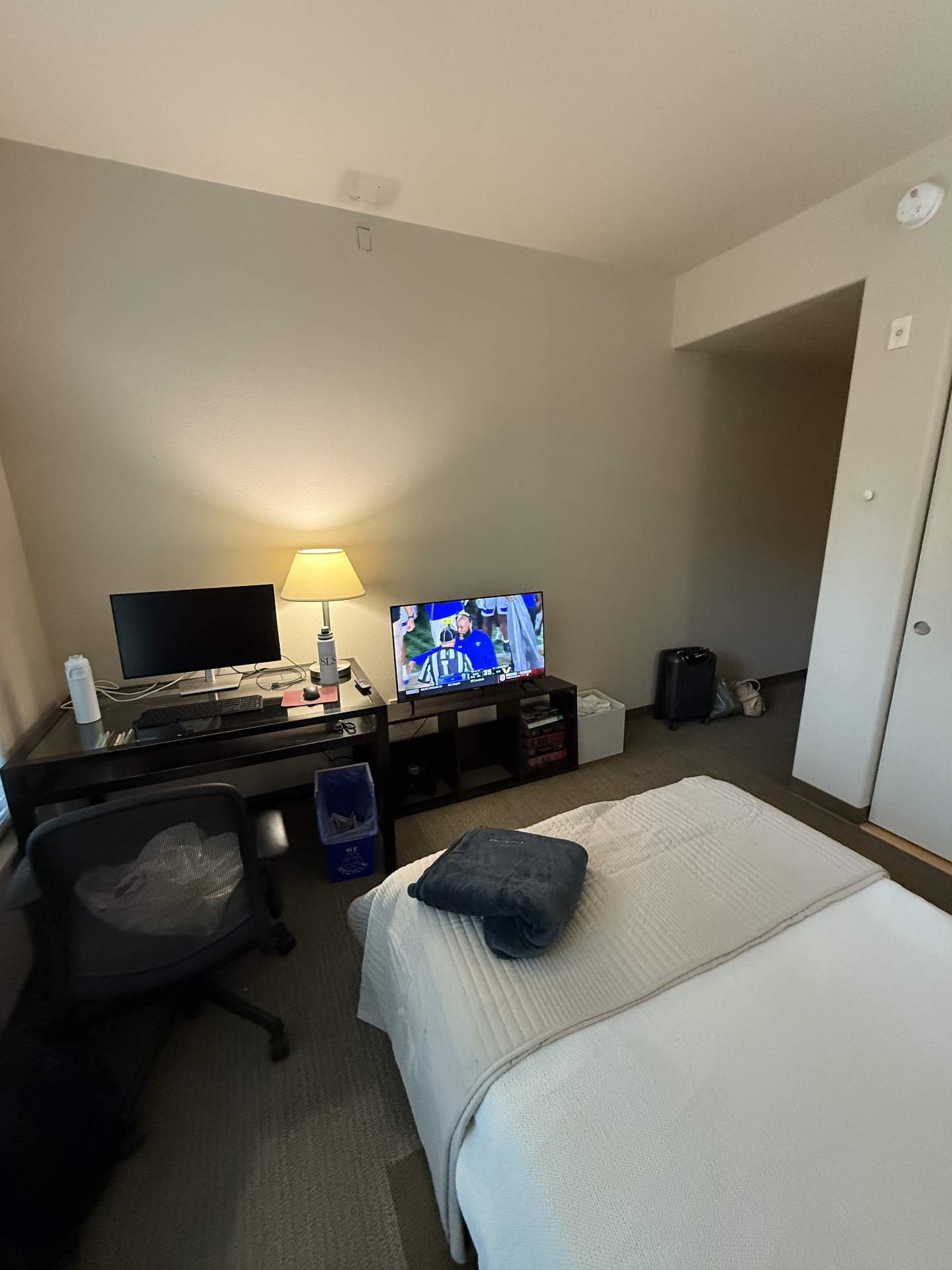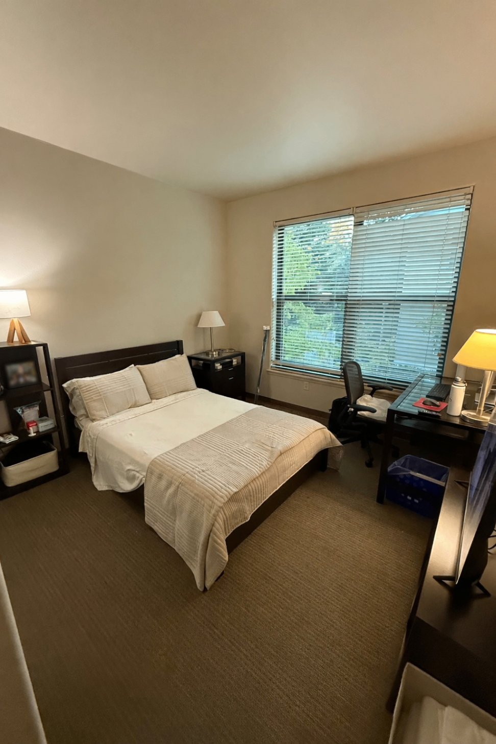 Fully furnished bedroom (bed, desk, chair, dresser)