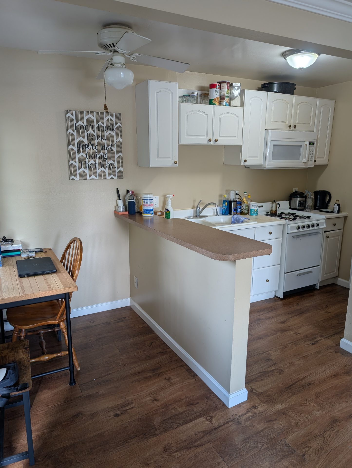 Kitchen + living/sitting area. The layout creates a separate nook that works well as a small office. So the area is semi separate into kitchen, office and sitting/dining areas.
