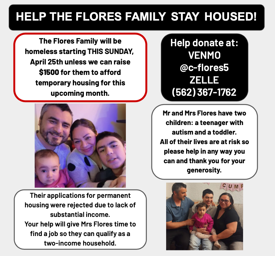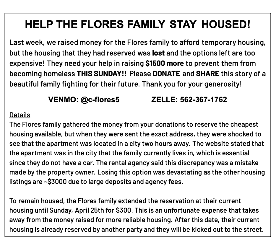 A group of students and I are hosting a fundraiser for the Flores family who will be HOMELESS THIS SUNDAY unless we can help them raise $1500!! We are at 1/4 of our goal so please DONATE and SHARE if you want to help them find safe shelter!! 🖤 See @xnessaloves on insta for more info