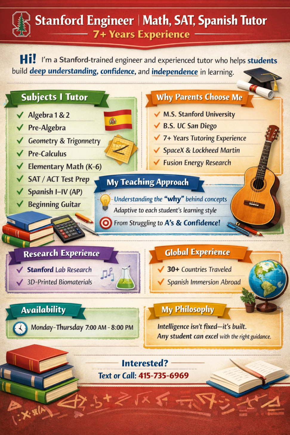 Hi! I'm a Stanford-trained engineer and experienced tutor who helps students build deep understanding, confidence, and independence in learning.