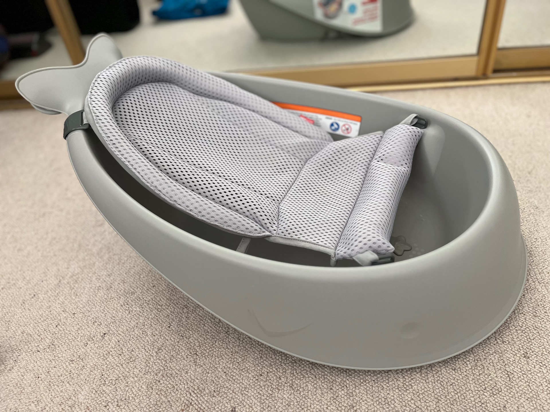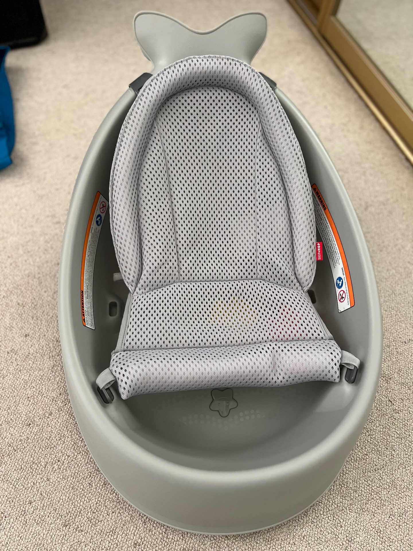 Gently used popular 3-stage infant bathtub (Skip hop whale) with sling insert to allow worry-free bathing of newborns.