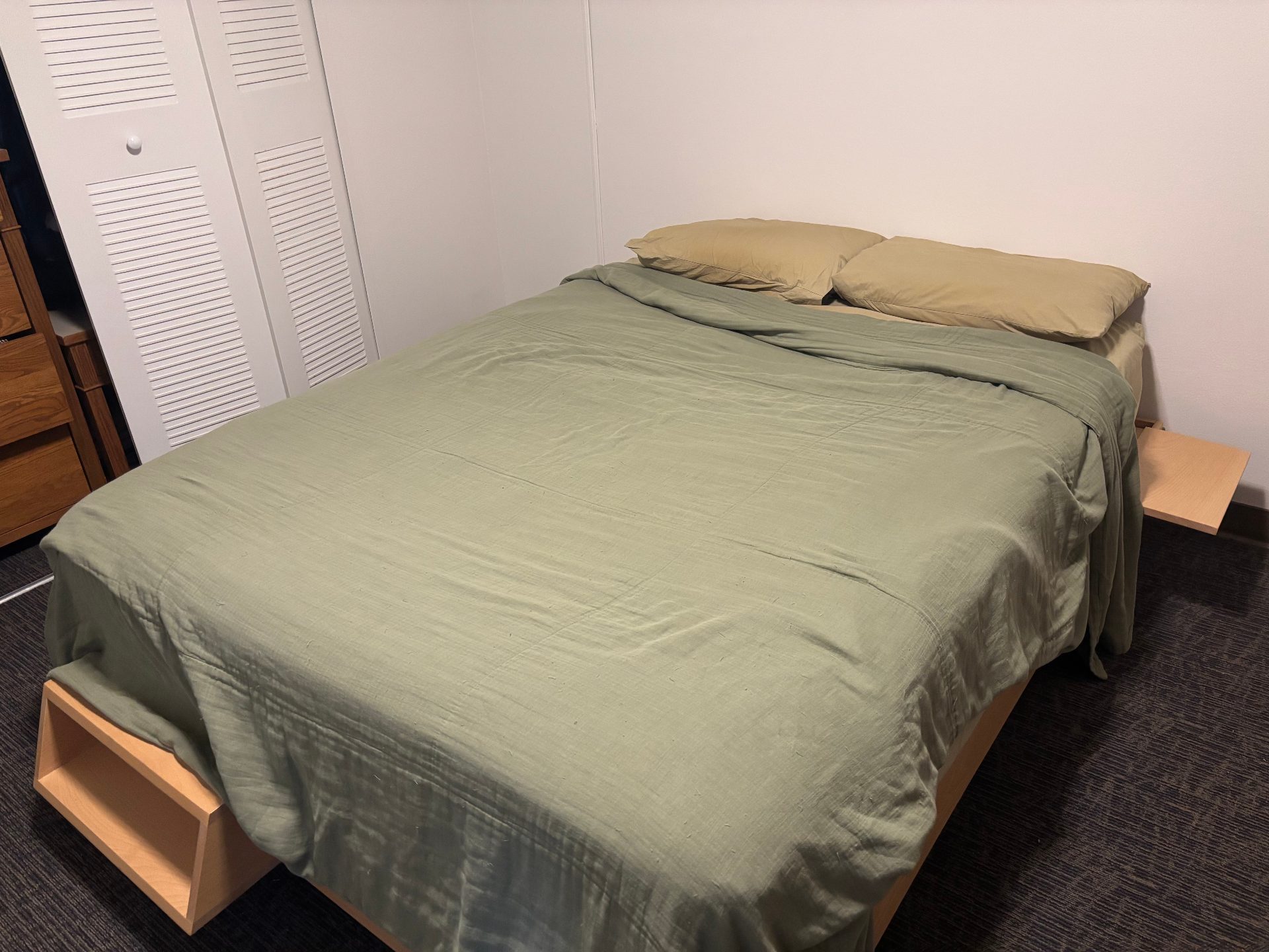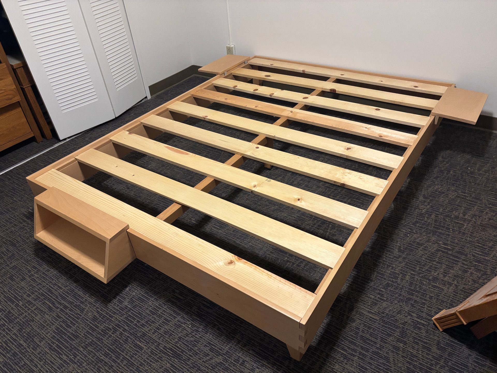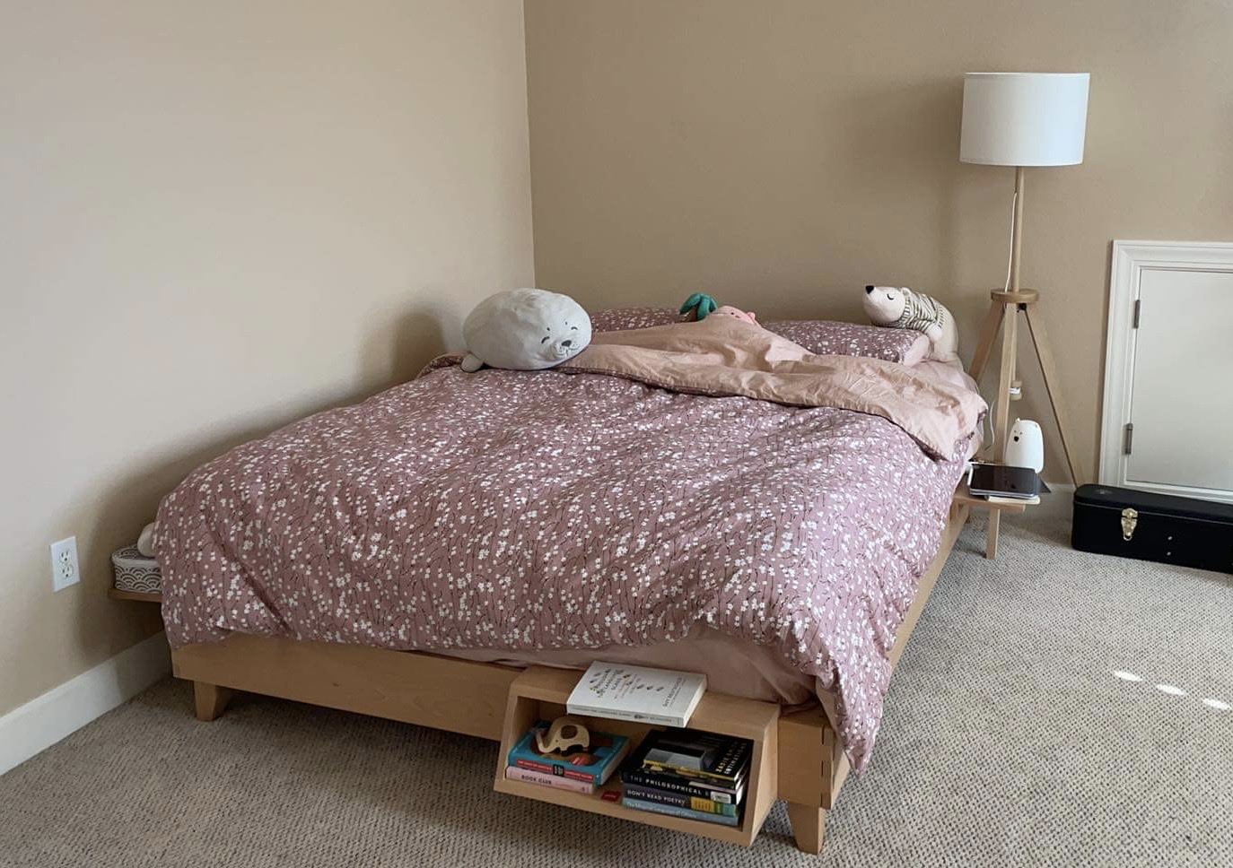 Aesthetic light-colored solid wood platform bed frame from Avocado Mattress, with compatible shelves and a book nook included (they slot into the frame). Tool-free assembly.